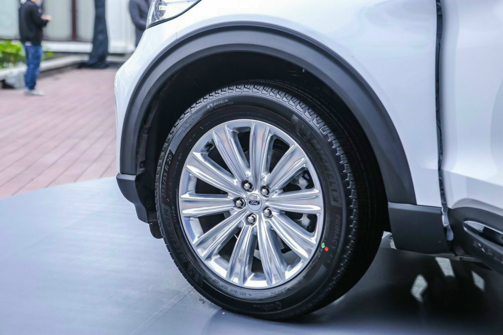 La-zăng Explorer có thiết kế đa chấu, được sơn bạc có lớp phủ bóng